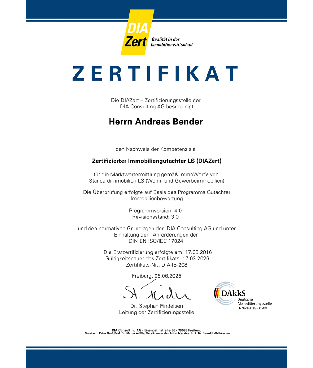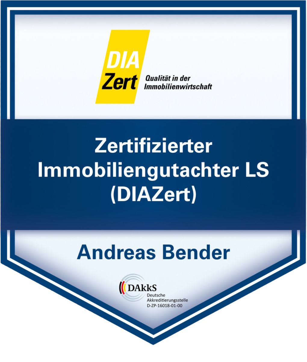 Seit 2006 Jahren bin ich, Andreas Bender, im Immobilienbereich tätig. Mir war und ist es ein Anliegen, meine Kunden so professionell wie möglich zu beraten und mich hierfür regelmäßig weiterzuqualifizieren. Daher habe ich mich zusätzlich als Sachverständiger für Verkehrswertermittlung fortgebildet und bin auch in diesem Bereich seit nunmehr 2012 tätig.